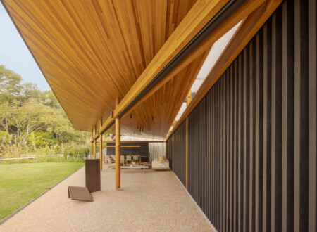 GAK is a home centered around a courtyard where the main architectural program is distributed in small pavilions. Meeting and leisure areas are surrounded by movable glass panels, allowing them to be fully integrated with the garden, creating a visual connection and a shared living experience. The bedroom core is protected by an independent circulation created by vertical wooden elements that separate it from the garden, while balconies open to the external landscape.